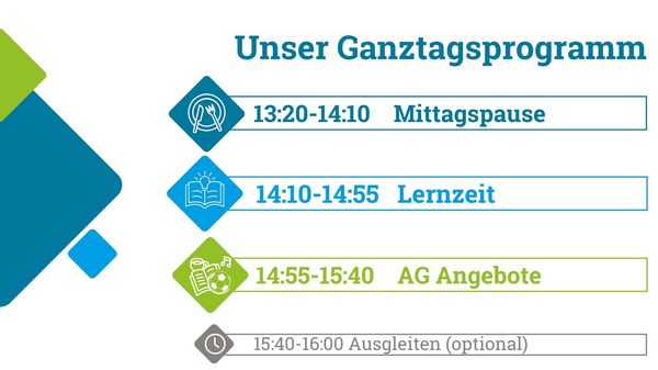Im Ganztag wird der Unterricht um pädagogische Angebote am Nachmittag ergänzt. Die Schüler*innen verbleiben bis 15.40 oder wahlweise bis 16.00 Uhr in der Schule und haben je nach Jahrgang und gewählten Angeboten (z.B. Gesangsklasse) ein unterschiedliches Programm. Beispiele für die Gestaltung der Nachmittage: